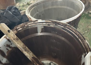 本日は倉庫にて、**店舗塗装工事に伴う建具類のOS塗装(ウォルナット色)**を行っております。 現地施工前に、倉庫内で仕上げ作業を行うことで、塗装ムラや色ブレを