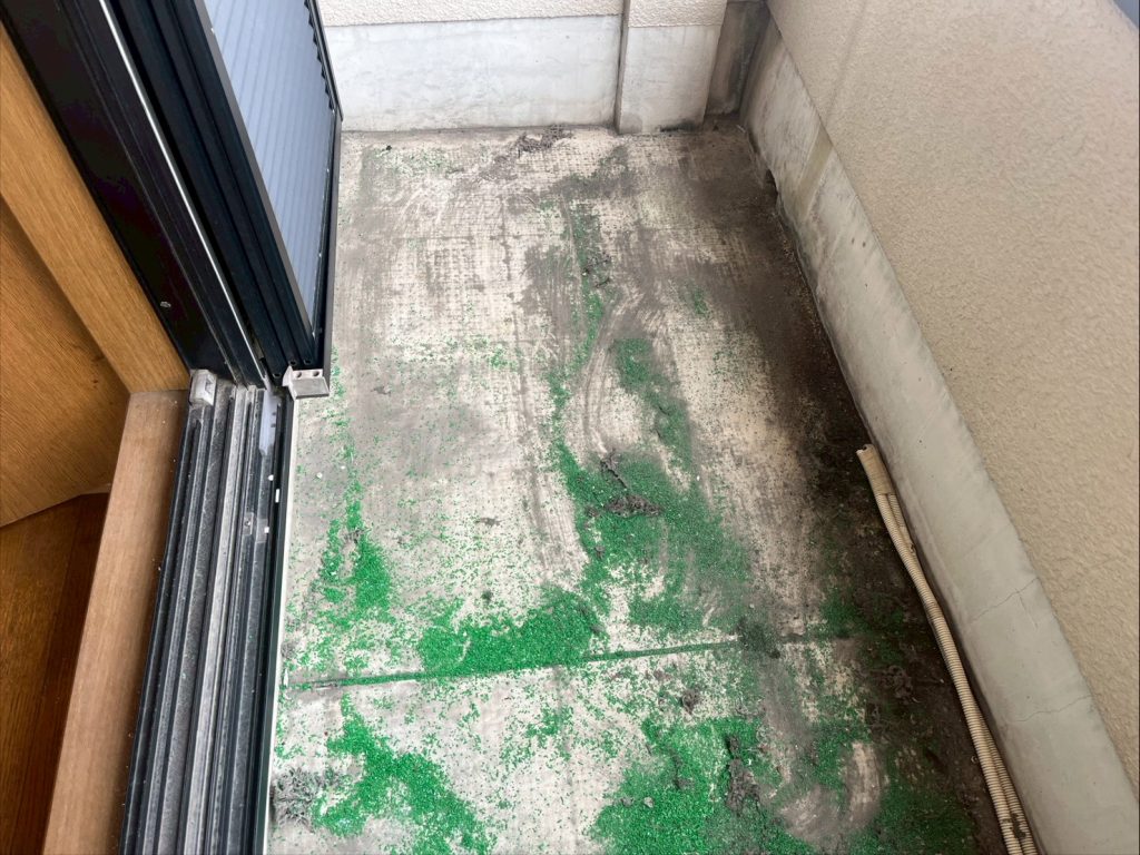 既存の床面には防水処理が施されていない状態で、雨水が溜まりやすく、劣化が進行している状況でした。