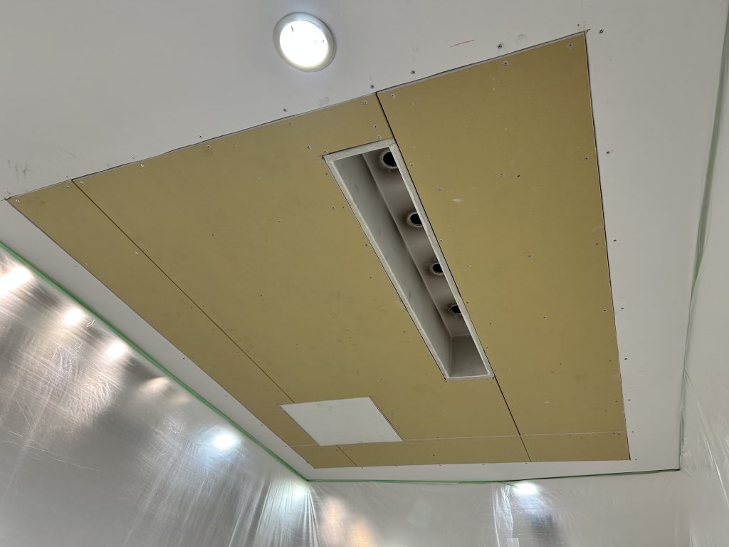 目的:石膏ボードの継ぎ目や下地のひび割れ防止のために、ガーゼ状の布を貼り付けて補強する工程。