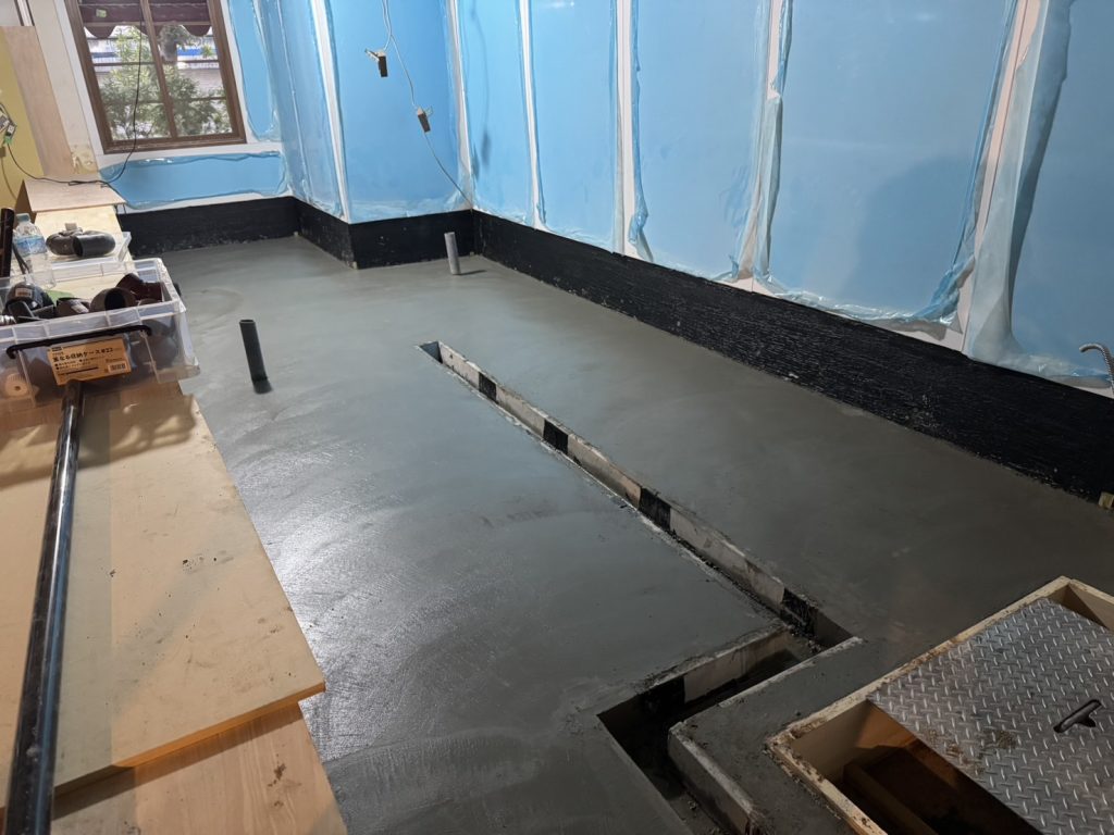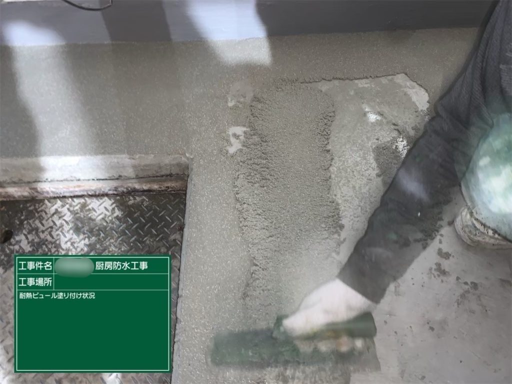 M3工法は、水性硬質ウレタン樹脂を使用した厚膜タイプの塗床材で、100℃までの熱水に耐える設計。スチーム洗浄や釜下など、従来の塗床材では劣化しやすかった箇所にも安心して使用できます。