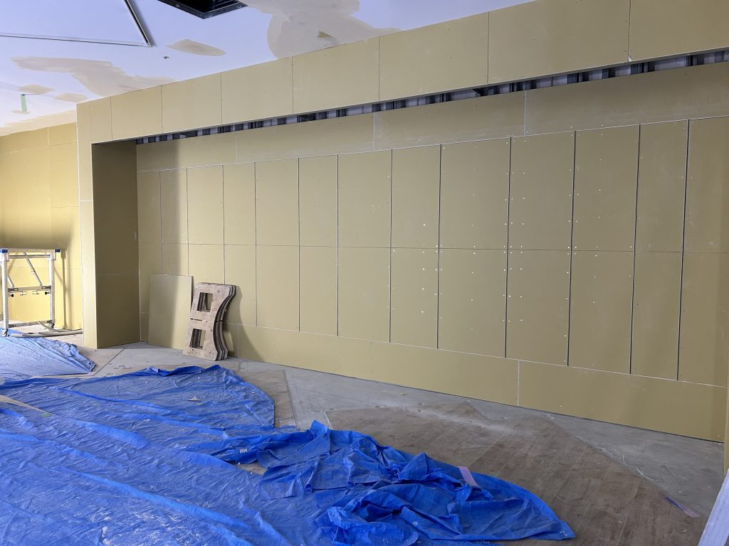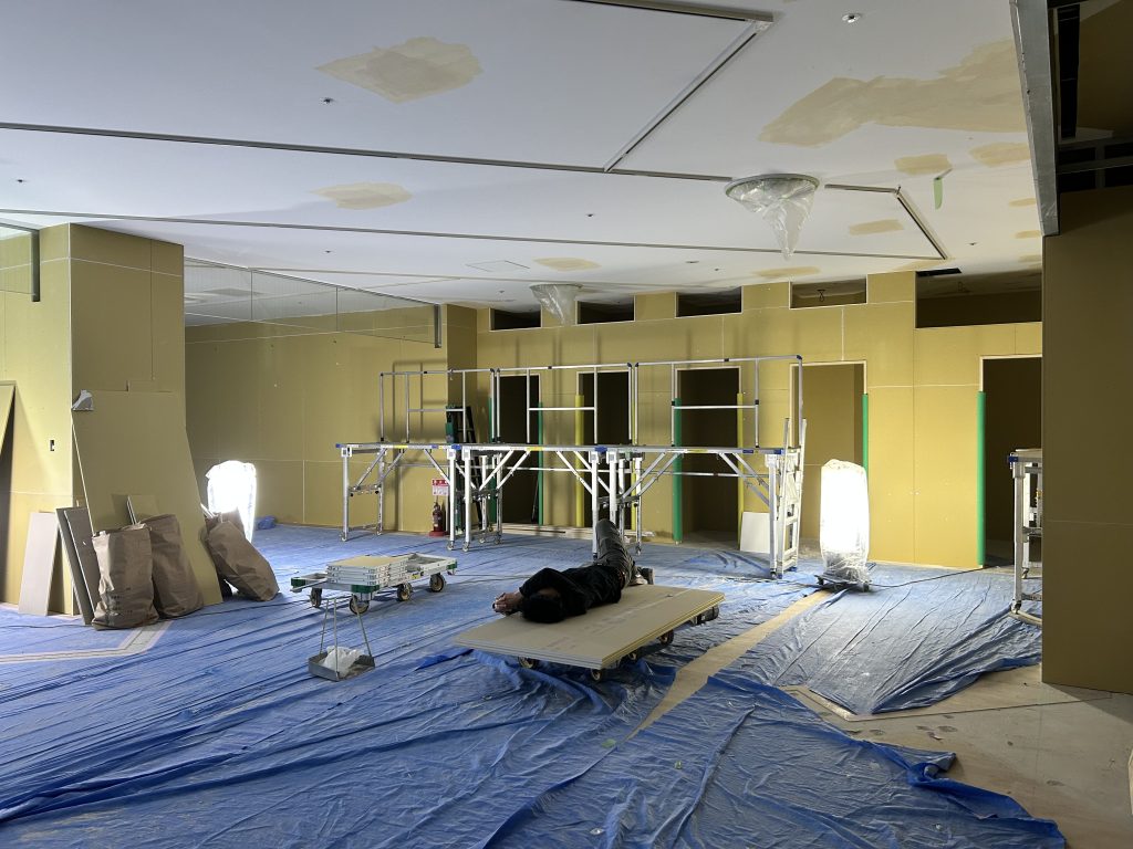 目的:石膏ボードの継ぎ目や下地のひび割れ防止のために、ガーゼ状の布を貼り付けて補強する工程。